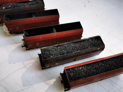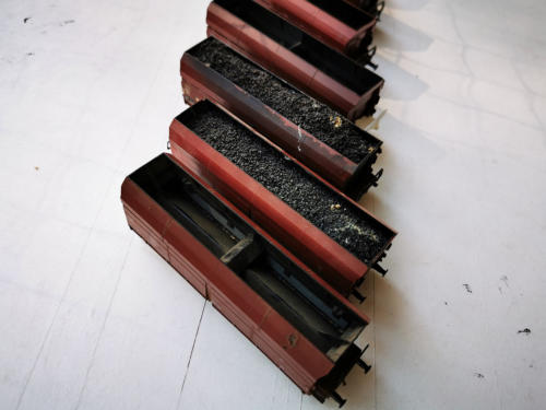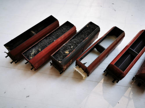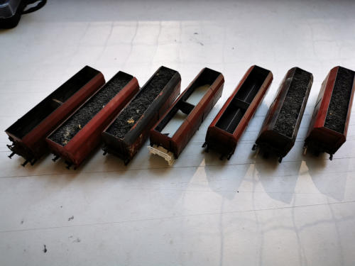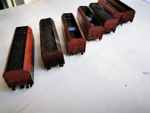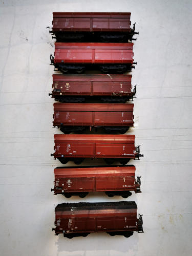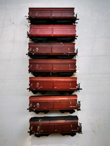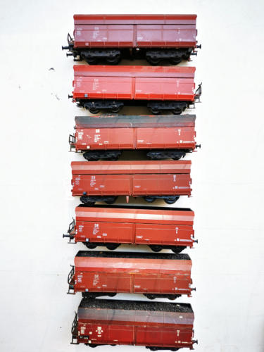 Hier gibt es 7 Selbstentladewagen von BTTB. Dies ist ein Bastelprojekt. Ich wollte ursprünglich überall neue Achsen und Kulissen drunter setzen.